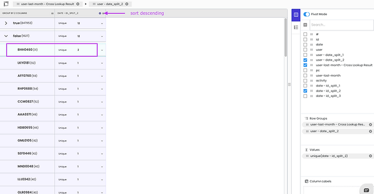 We used Gigasheet's pivot table to reveal the number of months per user ID in the false group by counting the unique values in the month column against each user ID.